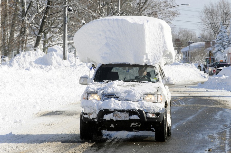 Read moreA vehicle, with a large chunk of snow on its top, drives along Route 20 after digging out after a massive snow fall in Lancaster, New York, on November 19, 2014. An autumn blizzard dumped a year's worth of snow in three days on Western New York state, where five people died and residents, some stranded overnight in cars, braced for another pummeling that hit later in the week. #