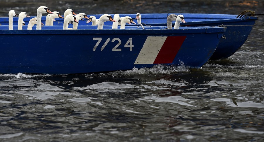 Read moreSwans ride in a boat after they were rounded up from Hamburg's inner city lake Alster on November 18, 2014. Every year the swans are collected from waterways around the northern German city of Hamburg and taken to winter quarters where they are fed and cared for until the spring. #