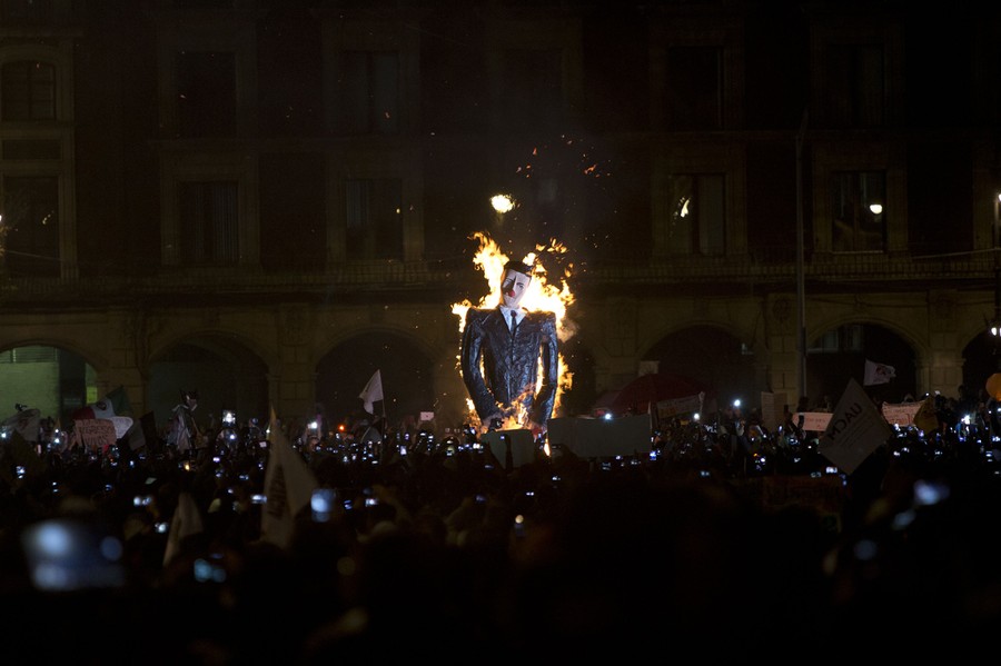 Read moreAn effigy depicting Mexico's President Enrique Pena Nieto is set on fire during a massive march in Mexico City on November 20, 2014. Protesters marched in the capital city to demand authorities find 43 missing college students, seeking to pressure the government. Mexico officially lists more than 20 thousand people as having gone missing since the start of the country's drug war in 2006, and the search for the missing students has turned up other, unrelated mass graves. #
