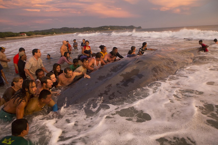 Read moreResidents and tourists push a whale to try to return it to the ocean from Popoyo beach in Rivas, Nicaragua on November 14, 2014. They were unable to help the beached whale discovered Friday morning. #