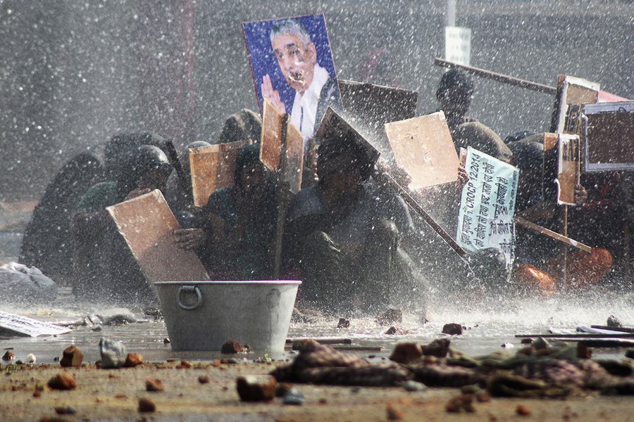 Read moreSupporters of Satguru Rampalji Maharaj, a self-styled "godman" take shelter under placards as they are hit by a police water cannon during a protest outside the ashram of Rampal in Hisar in the northern Indian state of Haryana on November 18, 2014. Followers of the guru, armed with clubs and stones, defied rounds of teargas from Indian security forces on Tuesday, preventing police from arresting the controversial guru who is wanted on murder charges. Police eventually broke through the human chain of men, women and children around the fortress-like, sprawling hermitage where the 63-year-old Satguru Rampalji Maharaj lived in the state of Haryana, 170 km (105 miles) northeast of New Delhi. #
