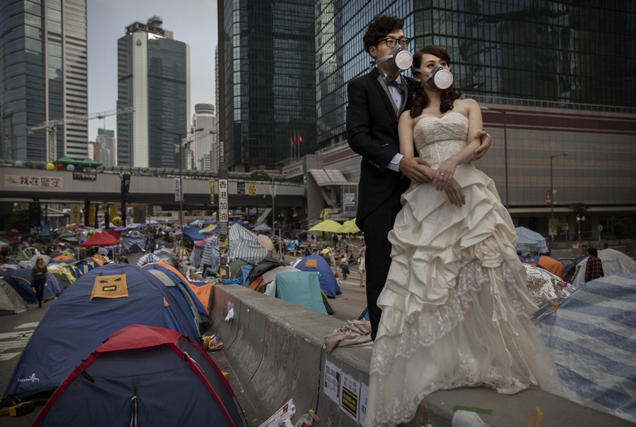 Read moreA young Hong Kong couple who did not give their names wear gas masks as they pose for a wedding photographer prior to their marriage next to the tents used by pro-democracy demonstrators at the Admiralty protest site on November 14, 2014 in Hong Kong. #