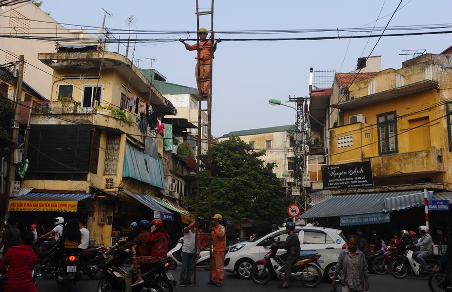 Read moreElectricity workers use a long bamboo ladder to fix an electrical cable in downtown Hanoi on November 20, 2014. World Bank has recently approved a loan of 500 million USD to Vietnam to improve the country's capacity, efficiency and reliability of electricity transmission system in key areas including Hanoi, Ho Chi Minh City, the Mekong Delta and the Central Region. #