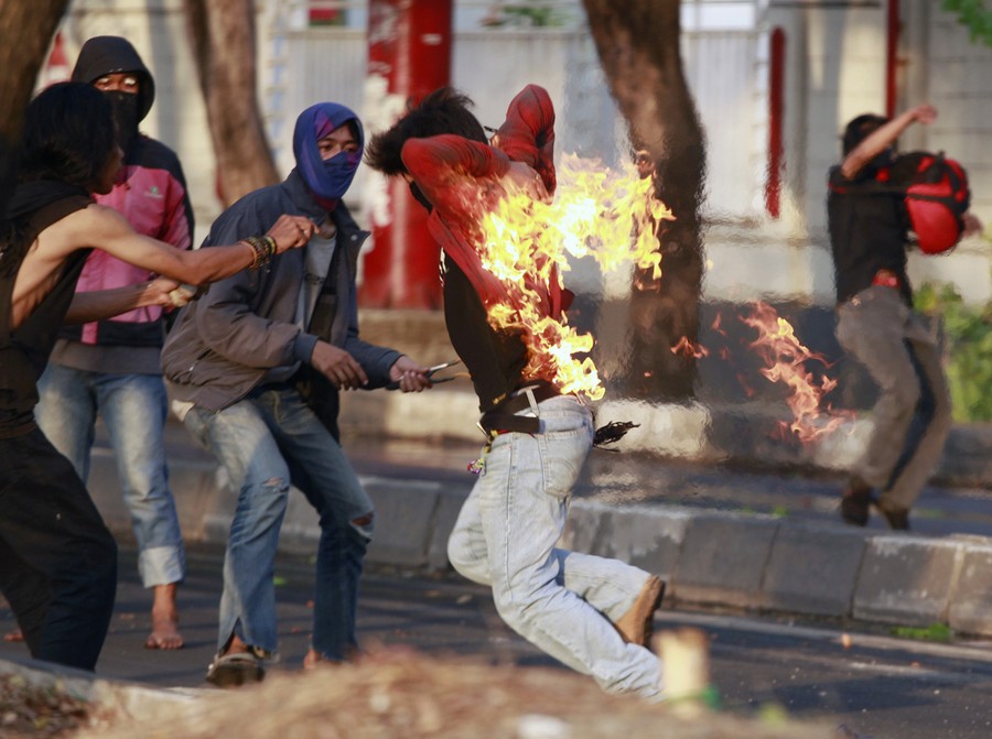 Read moreAn Indonesian student protester runs after he caught fire while throwing a Molotov cocktail towards police during a protest against the new president's decision to hike fuel prices this week in Makassar, South Sulawesi Province, on November 19, 2014. #