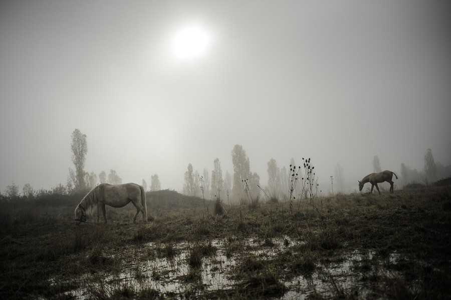 Read moreA foal, right, walks on the land next to a mare as fog covers the landscape during a foggy autumn sunrise in Ezquiroz, near Pamplona, northern Spain, on November 18, 2014. #