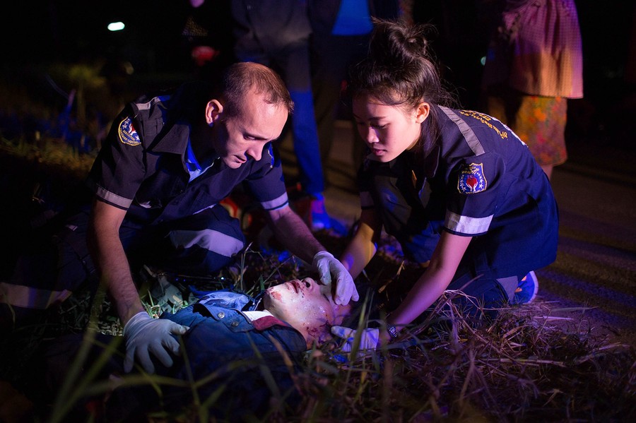 Read moreVolunteers treat a severely injured motorbike accident victim on the side of the road on December 6, 2014 in Vientiane, Laos. Vientiane Rescue is an all-volunteer rescue squad established in 2007 primarily to provide ambulance services to the staggering number of road accident victims in the nation's capital. The severely underfunded group receives no government monetary support and operates on donations from the local and international communities. #