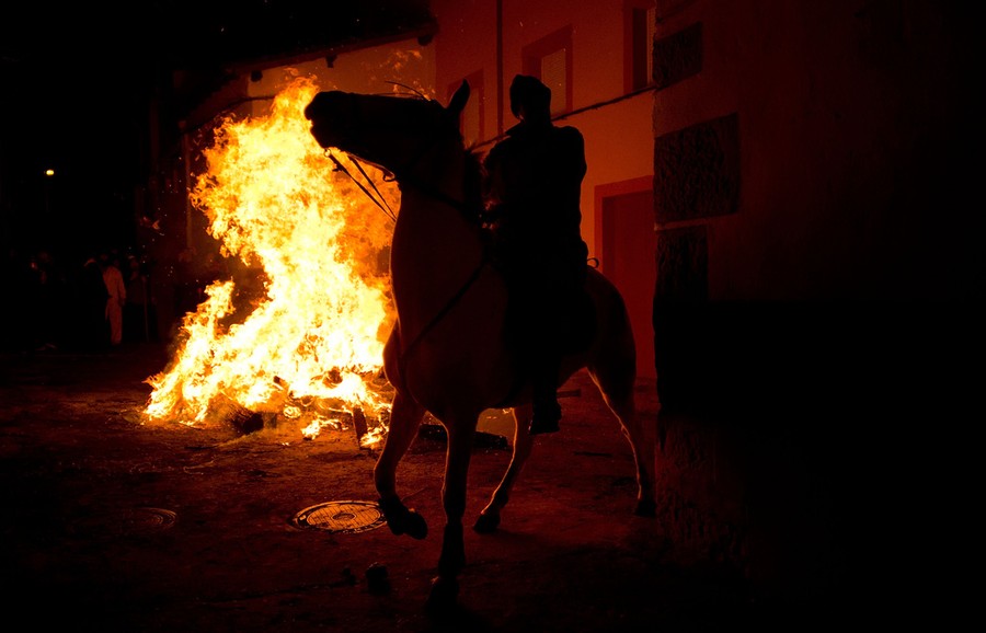 Read moreA man on horseback rides past a bonfire with his horse during the "Virgin's Conception" procession as part of the Los Escobazos Festival on December 7, 2014 in Jarandilla de la Vera, Spain. The origin of this festival is unconfirmed. Most believe that it comes from when goat shepherds came down from the mountains to celebrate the Virgin's Conception Day (December 8th) the night before. In order to see, they would light some branches of a brush called "Escobones" (Brooms). After a long season outside home, as a game, the shepherds entered the town hitting family and friends with the burning brooms. Each December the 7th, the festivity begins at nightfall when people light bonfires in the streets and hit each other with burning brooms. After this people take the "torches" to the religious procession where the Virgin Conception flag is carried by a man on horseback. Once it has finished, the party continues with people dancing, eating and drinking "pitarra" wines gathered at the remaining bonfires. #