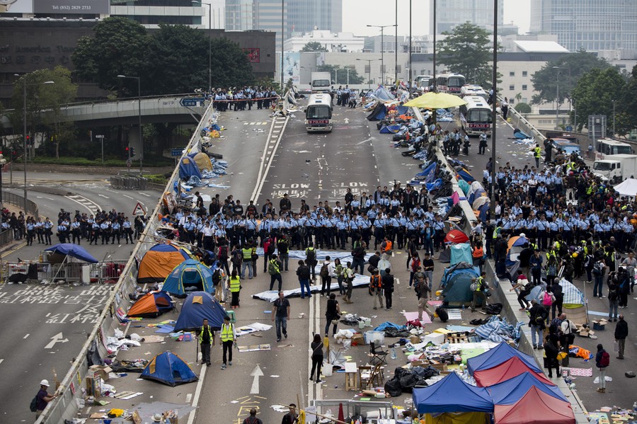 Read morePolice officers stand in a line as they prepare to clear tents outside Hong Kong's Government complex on December 11, 2014 in Hong Kong. After more than two months and drawing crowds of over 100,000 the main Admiralty pro-democracy protest site is cleared away by bailiffs and police after a court injunction paved the way for officials to clear three parts of the site. #