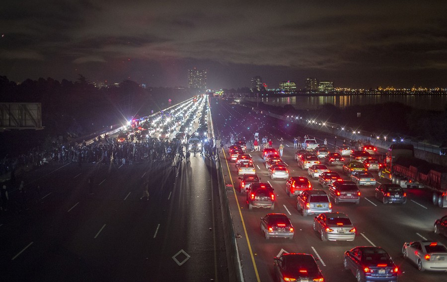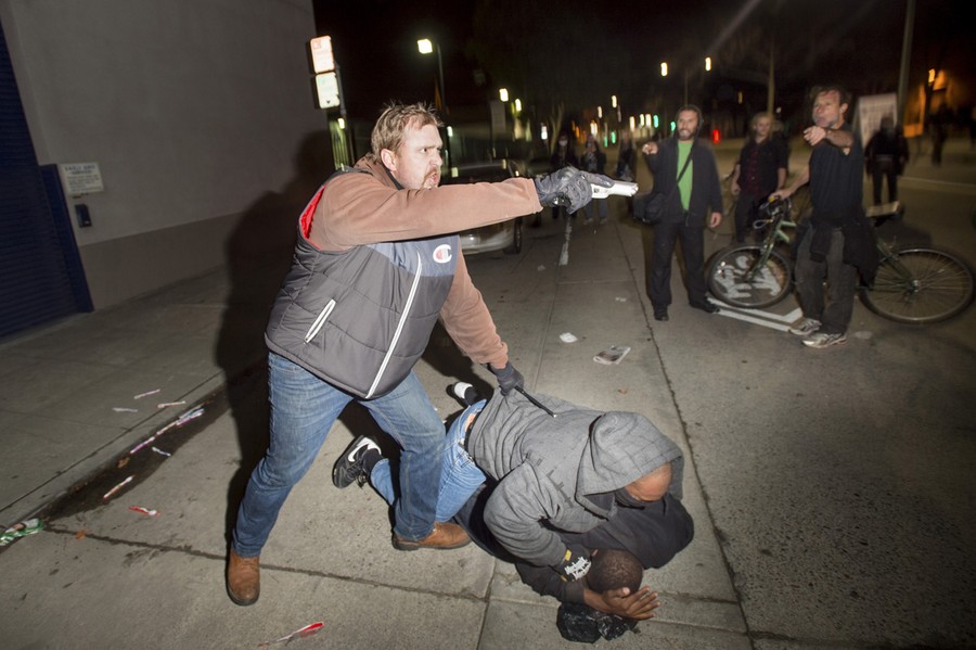 Read moreA plain-clothes California Highway Patrol detective, who had been marching with anti-police demonstrators, aims his gun at protesters after some in the crowd identified him and his partner during an arrest in Oakland, California, December 10, 2014. Chief Avery Browne, commander of the California Highway Patrol's Golden Gate Division, said two plainclothes CHP detectives were surrounded by up to 50 demonstrators who ignored orders to back off, despite one of the officers first taking out his baton and identifying himself as police. #