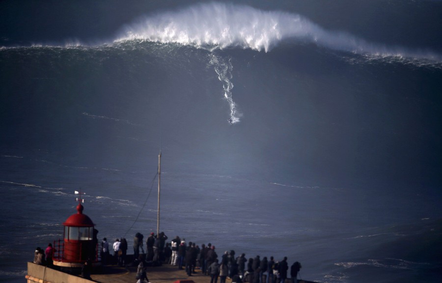 Read moreA surfer drops in on a large wave at Praia do Norte, in Nazare, on December 11, 2014. Praia do Norte beach has gained popularity with big wave surfers since Hawaiian surfer Garrett McNamara broke a world record for the largest wave surfed here in 2011. #