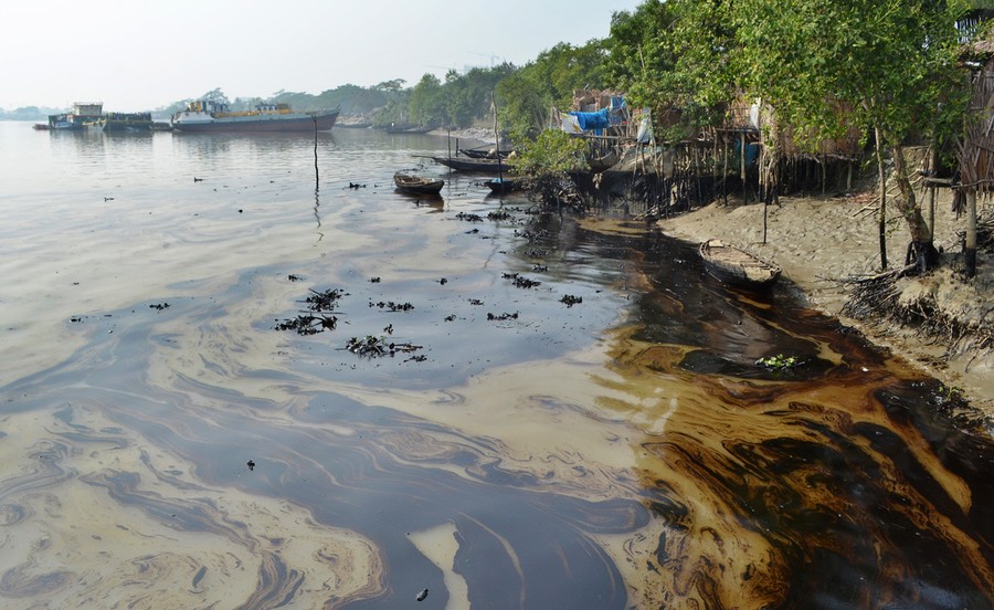 Read moreAn oil slick lines the banks of the Shela River after an oil tanker sank in one of the world's largest mangrove forests, threatening wildlife in the UNESCO World Heritage site of the Sundarbans in Bangladesh, on December 12, 2014. The oil tanker carrying more than 350,000 liters (92,500 gallons) of bunker oil sank Tuesday on the major river flowing through the Sundarbans after being hit by a cargo vessel. The slick had spread over up to 70 kilometers (45 miles) of the Shela river, threatening several types of animals including rare Irrawaddy dolphins, a senior official of the Bangladesh Forest Department said. #