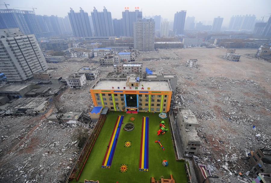 Read moreA kindergarten, surrounded by rubble, at a demolition site in Xi'An, Shaanxi province, China, on December 8, 2014. According to local government, the kindergarten has been running without license and will be forced to shut down. #
