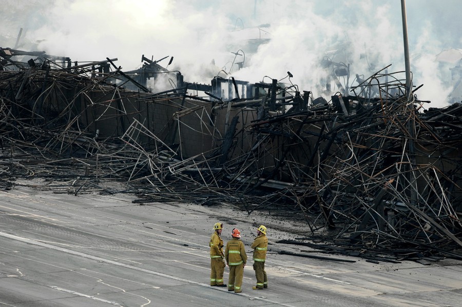 Read moreFirefighters stand on lanes of the 110 freeway near smoldering hot spots of a large fire that consumed an apartment building that was under construction in Los Angeles, California, on December 8, 2014. The blaze in downtown Los Angeles early on Monday shut down two major freeways, the Los Angeles Fire Department and California Highway Patrol said. The fire was extinguished, but firefighters were still on the scene monitoring hot spots. There were no reports of injuries or fatalities in the fire. #
