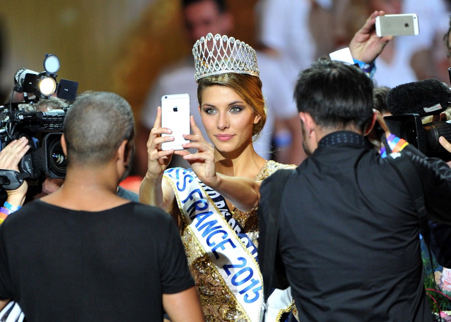 Read moreMiss Nord-Pas-de-Calais Camille Cerf takes a selfie photo with her smartphone right after winning the Miss France 2015 beauty contest on December 6, 2014 in Orleans. #