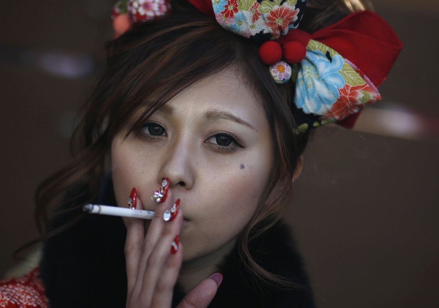 Read moreJuri Mitomi, 20, holds a cigarette after a Coming of Age Day celebration ceremony at an amusement park in Tokyo on January 12. According to a government announcement, more than 1.2 million men and women who were born in 1994 marked the coming of age this year, an increase of approximately 50,000 from last year. The increase is also the first since 1995. #