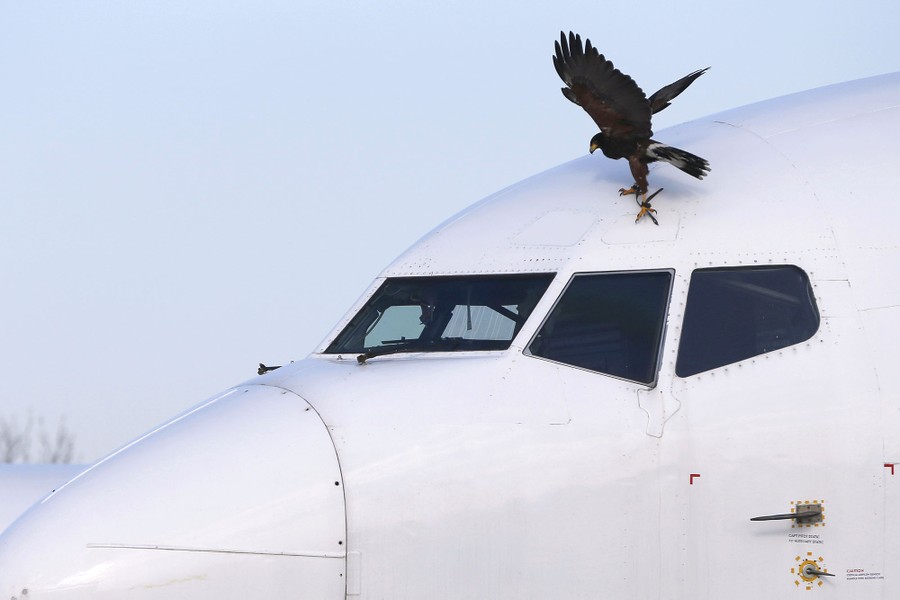 Read moreA Harris Hawk lands on an airplane near Belgrade's Nikola Tesla Airport on January 15. Belgrade's airport maintenance services area decided to use falconers to scare away pigeons and other birds from aircraft hangar buildings, according to officials. #