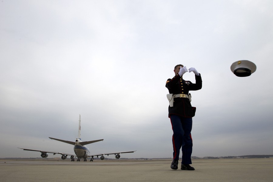 Read moreMarine Cpl. Chaz Sorensen loses his hat due to the jet's exhaust as Air Force One, with President Barack Obama aboard, departs from Andrews Air Force Base, Maryland, on January 21. #
