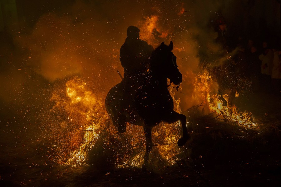 Read moreA man rides his horse through flames during the "Luminarias" annual religious celebration, on the night before Saint Anthony's, patron of animals, in the village of San Bartolome de los Pinares, Spain, on January 16. According to tradition that dates back 500 years ago, people ride their horses through the narrow cobblestone streets of this small village to purify the animals with the smoke of the bonfires. #