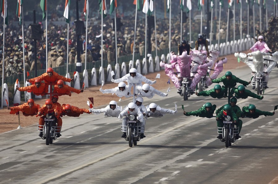 Read moreIndia's Border Security Force (BSF) "Daredevils" motorcycle riders take part in a full dress rehearsal for the Republic Day parade in New Delhi January 23. #