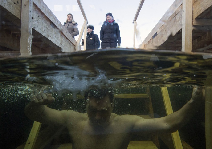 Read moreA man immerses himself in an ice hole in the Moskva river during celebrations for Russian Orthodox Epiphany on the outskirts of Moscow on January 19. Orthodox believers mark Epiphany on January 19 by immersing themselves in icy waters regardless of the weather. #