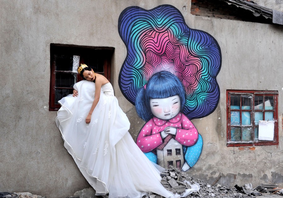 Read moreA bride poses for wedding photos at Kangding Road where old houses had been demolished on January 22 in Shanghai. More than 10 graffiti paintings were seen on old walls which were demolished in Jingan District in Shanghai. #