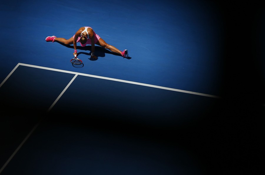 Read moreLucie Hradecka of the Czech Republic falls onto the court after missing a shot against Julia Goerges of Germany during their women's singles third round match at the Australian Open 2015 tennis tournament in Melbourne on January 23. #