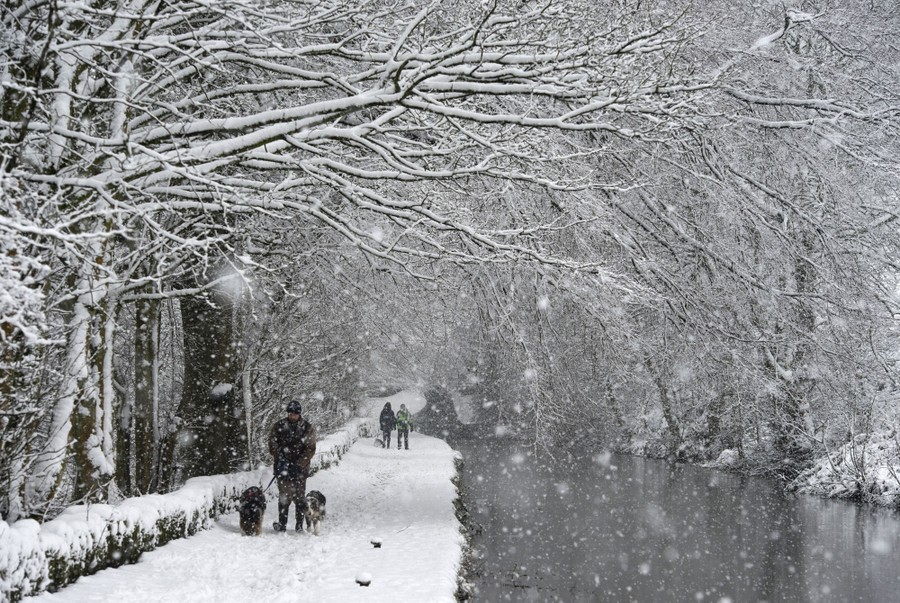 Read moreA man walks his dogs along the snow-covered towpath of the Huddersfield Narrow Canal in the village of Marsden, northern England, on January 21 during heavy snowfall. #