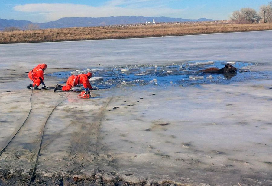 Read moreFirefighters rescue one of two cows that plunged through ice on a pond in Fountain, Colorado on January 27. Fountain Fire Chief Darin Anstine said it was unclear how long the cows had been in the water before a motorist spotted them, but they're now doing fine. #