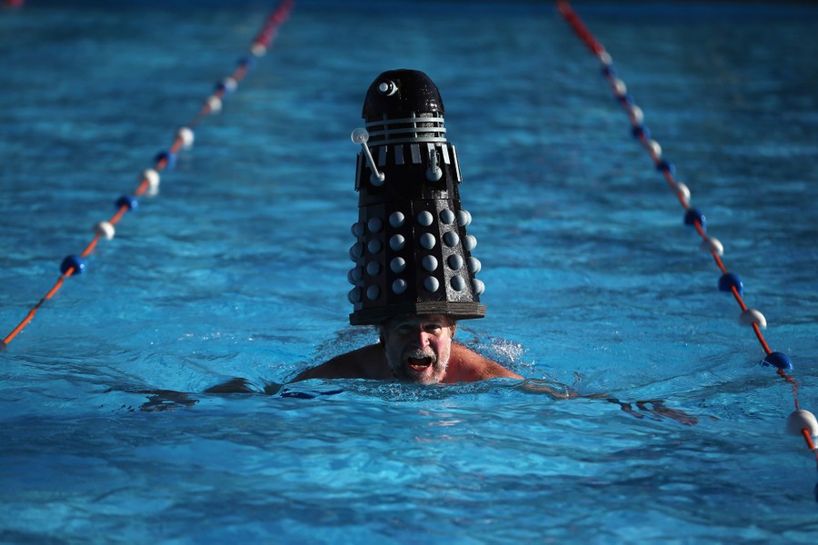 Read moreA competitor with a Dalek on his head takes part in the annual UK Cold Water Swimming Championships at Tooting Bec Lido on January 24 in London. Participants from around the world braved the cold water to compete in a selection of different swimming races. #