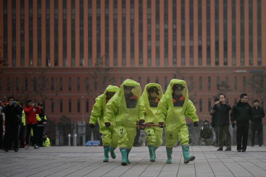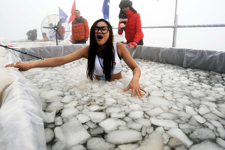 Read moreA participant taking part in an ice water challenge in Zhangjiajie, central China's Hunan province, on January 25. Participants were required to stay in an ice pond, holding an ice block while eating ice-cream with an electric fan blowing at them. #