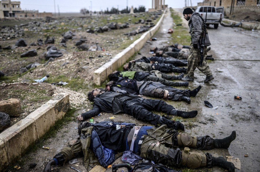 Click to view imageRead moreMusa, a 25-year-old Kurdish marksman, looks at bodies of alleged IS militants lying dead on the ground in the village of Halimce, east of the Syrian town of Kobane, on January 30, after Kurdish forces recaptured the town on January 26. #