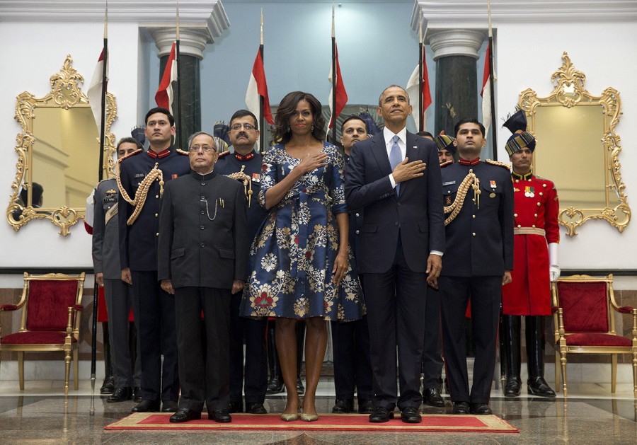 Read morePresident Barack Obama, first lady Michelle Obama, and Indian President Pranab Mukherjee stand during the US National Anthem before a receiving line at the State Dinner at the Rashtrapati Bhavan, the presidential palace, in New Delhi on January 25. Obama's arrival Sunday morning in the bustling capital of New Delhi marked the first time an American leader has visited India twice during his presidency. #
