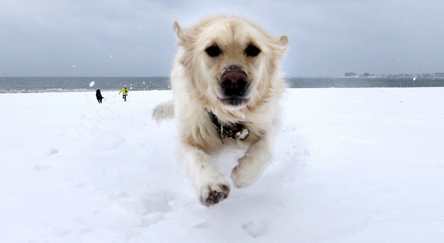 Read moreCrystal, a golden retriever, dashes through the snow as she gets away from Danielle Reid, a girl walking dogs with her mom, at Revere Beach in Massachusetts on January 26. #