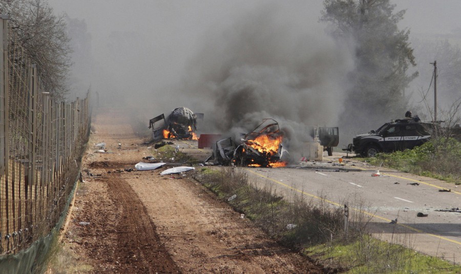 Read moreBurning vehicles are seen near the village of Ghajar on Israel's border with Lebanon on January 28. A Hezbollah missile strike wounded four Israeli soldiers on Wednesday, the biggest attack on Israeli forces by the Lebanese guerrilla group since a 34-day war in 2006. Israeli artillery fired at least 22 shells into open farmland in southern Lebanon after the strike, a Lebanese security source said. #