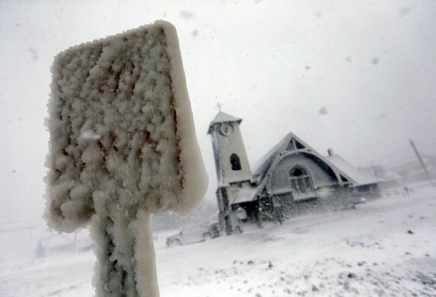 Read moreFrozen sea spray coats a road sign and a church are pictured during a winter storm in Marshfield, Massachusetts, on January 27. Police said the storm punched out a section of the seawall in the coastal town. #