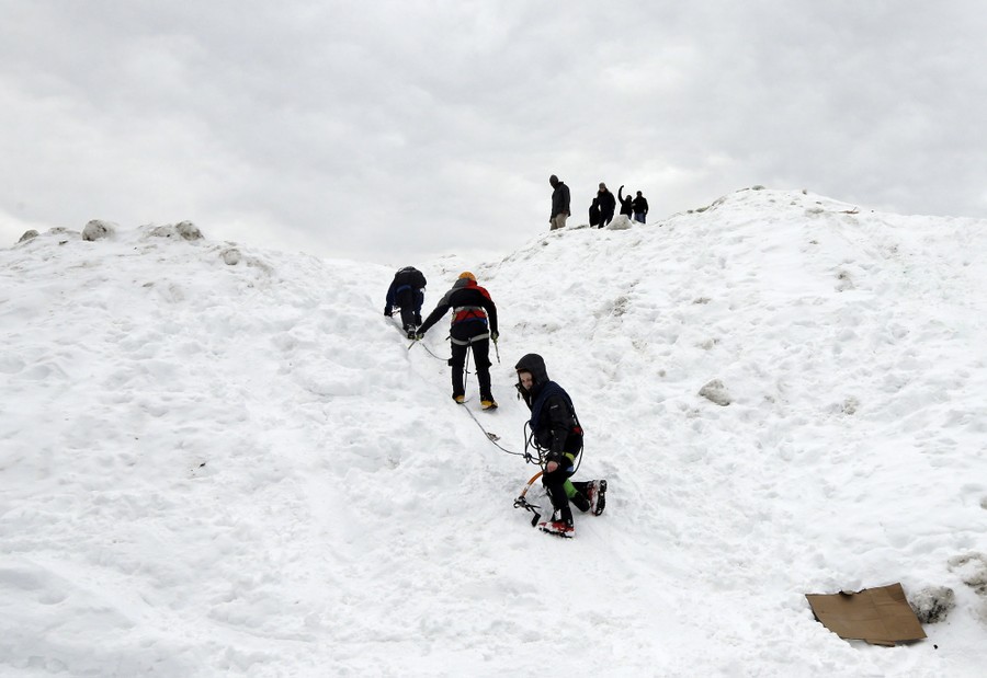 Read moreThree students from the Massachusetts Institute of Technology jokingly use mountaineering gear to make their way down from a massive snow pile on the MIT campus in Cambridge, Massachusetts, on February 18, 2015. The mountain of excess snow has been dubbed the "Alps of MIT" and is being used for climbing, sledding and posing. #