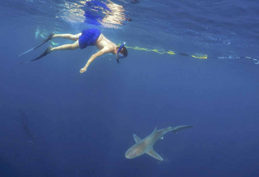 Read moreA tourist swims with a sandbar shark on a cageless shark dive tour in Haleiwa, Hawaii, on February 16, 2015. Shark tours are a renowned form of eco-tourism in Hawaii and diving with sharks without a cage is becoming increasingly popular as well. #