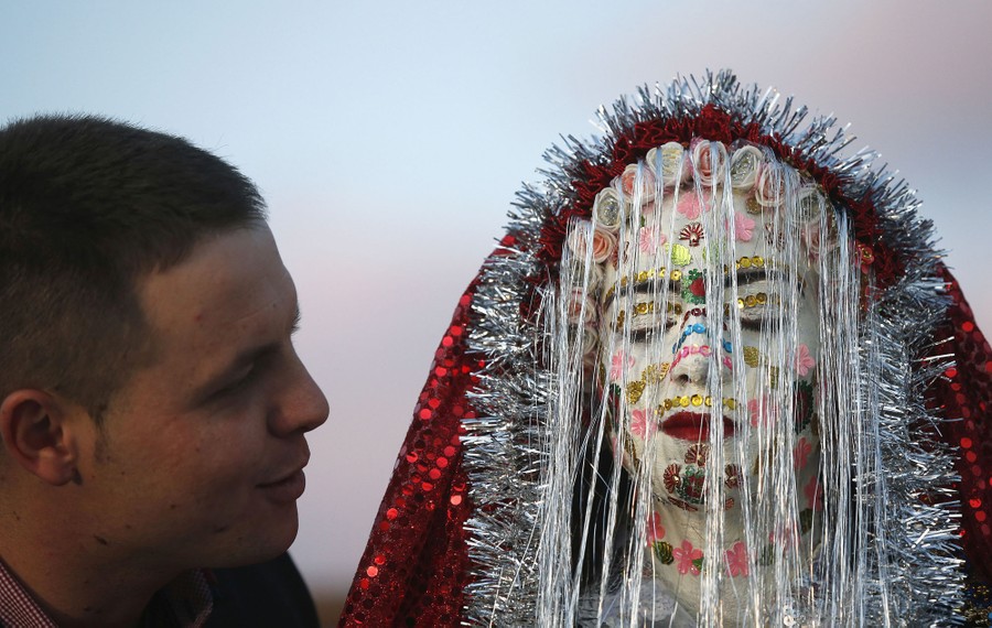 Read moreBulgarian Muslims Azim Liumankov and his bride Fikrie Bindzheva pose in front of their house during their wedding ceremony in the village of Ribnovo, in the Rhodope Mountains, on February 15, 2015. The remote mountain village of Ribnovo in southwest Bulgaria has kept its traditional winter marriage ceremony alive despite decades of Communist persecution, followed by poverty that forced many men to seek work abroad. The wedding ritual was resurrected with vigor among the Pomaks - Slavs who converted to Islam under Ottoman rule. The highlight of the ceremony is the painting of the bride's face, where in a private rite open only to female in-laws, her face is covered in thick, chalky white paint and decorated with colorful sequins. #
