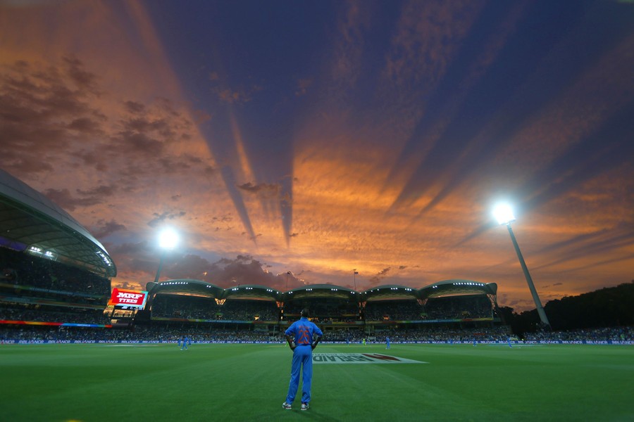 Read moreIndia's Shikhar Dhawan looks to the sky from his fielding position during sunset in their Cricket World Cup match against Pakistan in Adelaide on February 15, 2015. #