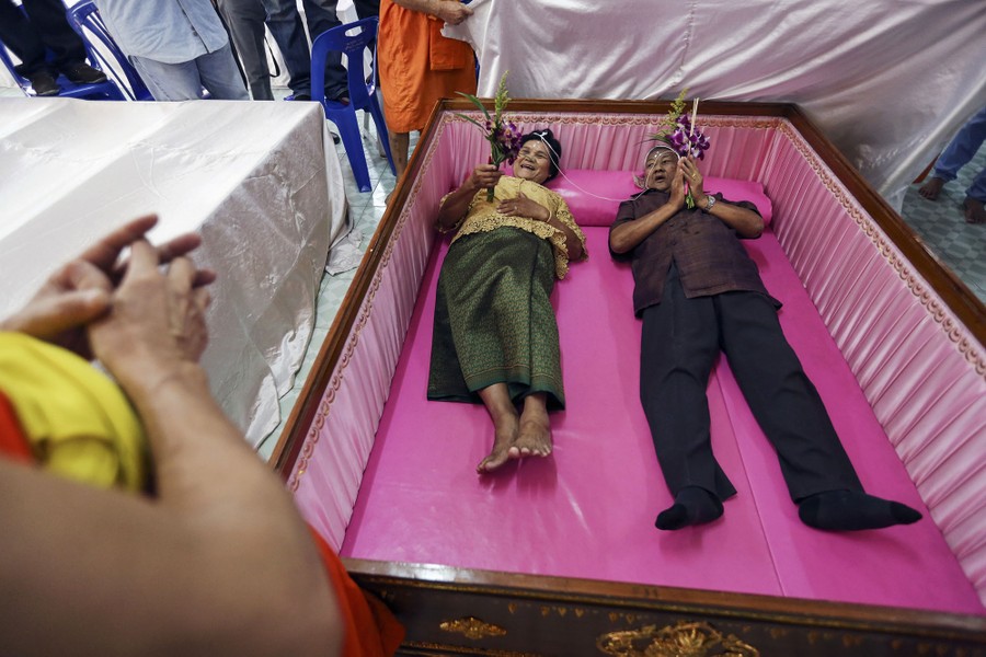 Read moreA groom and a bride lay inside a pink coffin during their wedding ceremony at Wat Takien temple in Nonthaburi province, on the outskirts of Bangkok, on February 14, 2015. Ten Thai couples laid in the pink coffin starting 9:09AM on Saturday during the wedding ceremony organized by the Buddhist temple on Valentine's Day. Couples believe laying briefly in the coffin will get rid of bad luck and usher happiness into their lives. #