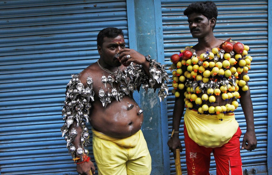 Read moreHindu devotees, their bodies pierced with lemon and paladai, or bowl with a spout mainly used to feed milk to infants, wait to participate in a procession to mark Shivratri, or the night of Shiva, in Chennai, India, on February 18, 2015. Such processions are held as an offering and show of devotion by devotees on the day dedicated to the worship of Lord Shiva, the Hindu god of destruction. #