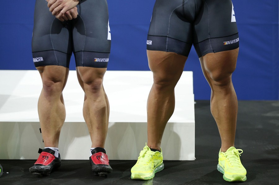 Read moreThe legs of third placed German team members Rene Enders (left) and Robert Forstemann (right) are pictured during the podium ceremony in the men's team sprint race at the UCI Track Cycling World Cup in Saint-Quentin-en-Yvelines, near Paris, on February 18, 2015. #