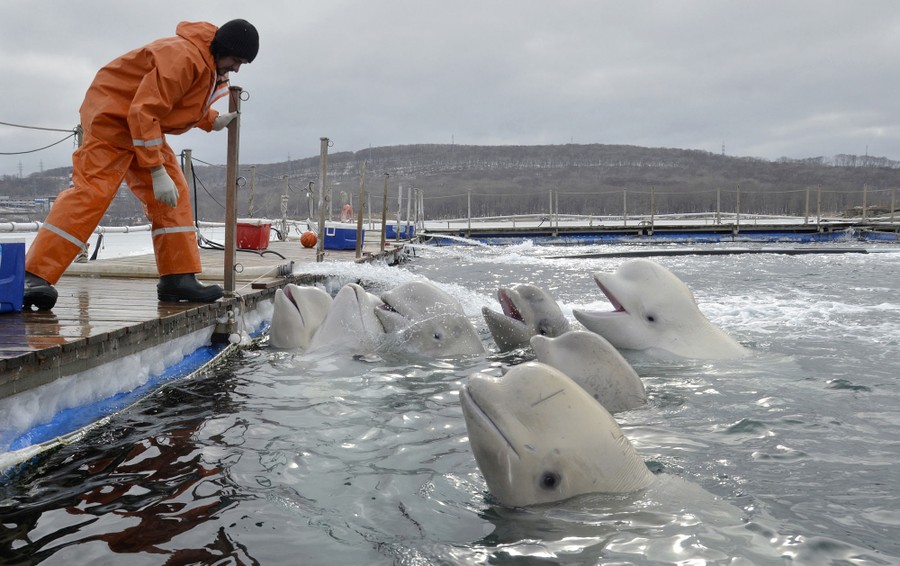 Read moreA trainer does exercises with Beluga whales at the temporary enclosure of an oceanarium at Russky Island in the far eastern city of Vladivostok, on February 17, 2015. Prosecutors in Primorsky Krai last week launched an investigation into the death of at least six sea animals and fish at the local oceanarium where construction was stalled as a result of a corruption scandal, local media reported. The oceanarium was supposed to be completed by the time of the Asia Pacific Economic Cooperation forum in Vladivostok in September 2012. #