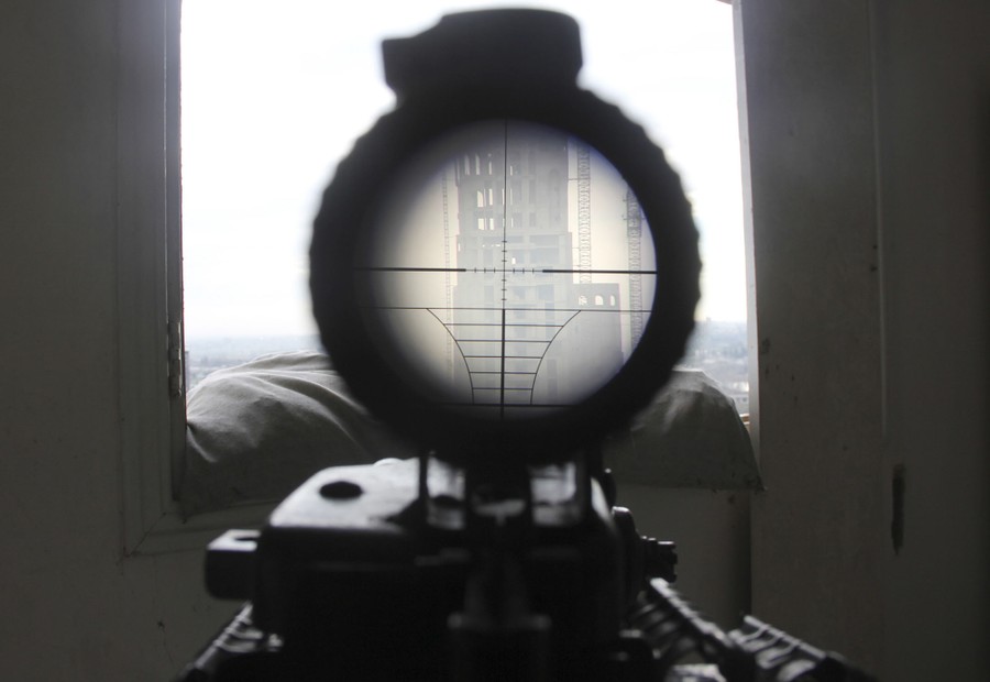 Read moreA view seen through the scope of a weapon belonging to a sniper and rebel fighter shows a building where forces loyal to Syria's President Bashar al-Assad are stationed, as seen from a rebel-controlled area in the northwestern Homs district of Al Waer, Syria, on February 18, 2015. #