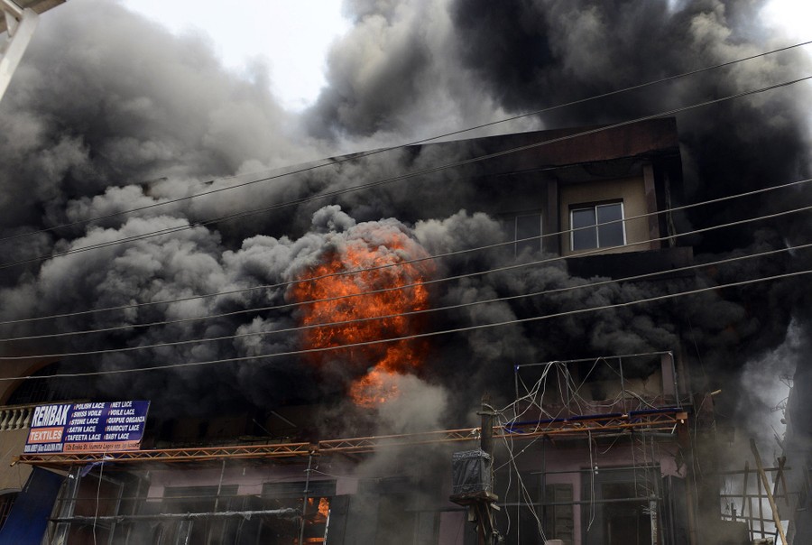 Read moreSmoke billows from the middle floor of a plaza at Idumota market in Lagos, Nigeria, on March 2, 2015. A building housing mostly imported textiles was gutted destroying goods worth thousands of dollars. #