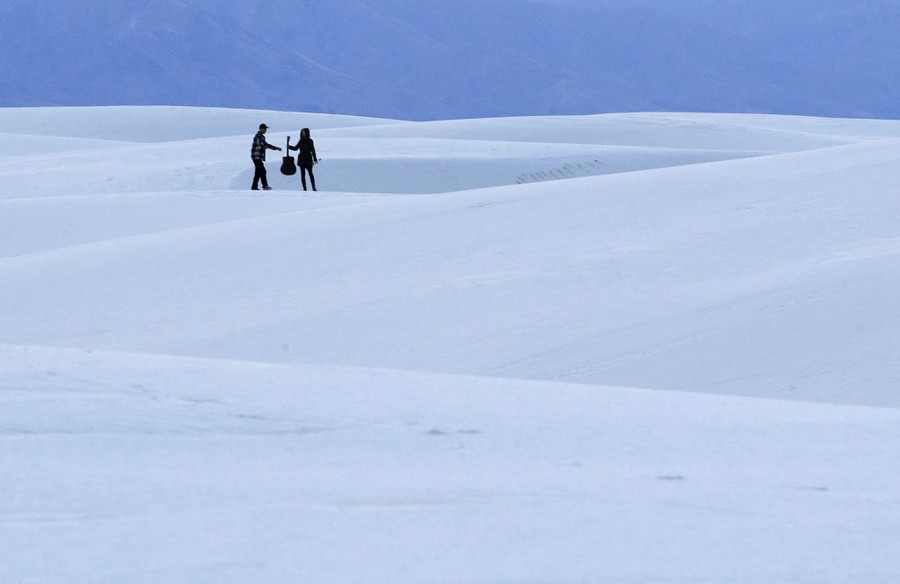 Read moreKristy Fogden, right, of New Zealand, hands her friend Dave Shaw a guitar as they stand on a sand dune at dusk on March 4, 2015, in White Sands National Monument, New Mexico. #