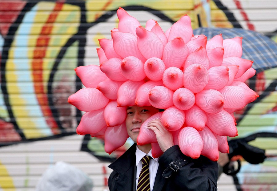 Read moreA Japanese man with balloons on his head waits to meet Prince William, Duke of Cambridge, outside Ishinomaki local newspaper office on March 1, 2015, in Ishinomaki, Japan. #
