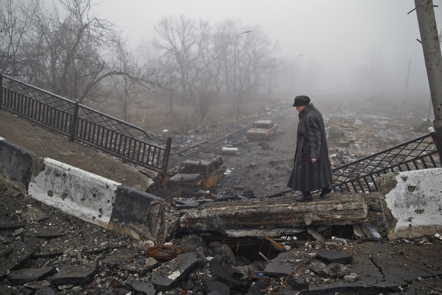 Read moreA woman walks on a destroyed bridge on the road to the airport which was the scene of heavy fighting, on her way to retrieve belongings from her home, in Donetsk, Ukraine, on March 1, 2015. #