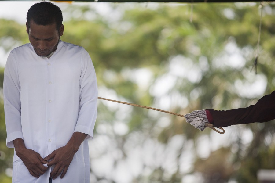 Read moreAn unidentified Acehnese man is caned in public at the Munawarah Jantho mosque compound in Aceh Besar district in Aceh province after the Friday prayer on March 6, 2015. Six men who were allegedly caught gambling by the sharia police were given punishment of five lashes in public in accordance with the strict Islamic sharia law implemented only in Indonesia's highly conservative province of Aceh. #