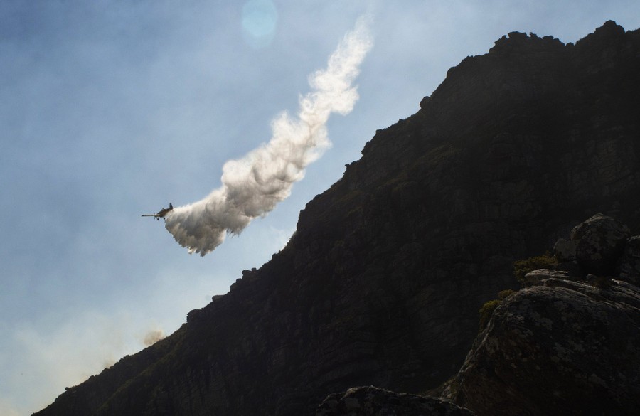 Read moreA firefighting aircraft dumps water on a part of a large bush fire raging in the mountains on the Cape Peninsula on March 2, 2015, in the greater Cape Town area of South Africa. Five houses and an upmarket hotel were destroyed and dozens of people evacuated from their homes as wildfires raged through Cape Town's scenic southern peninsula. #